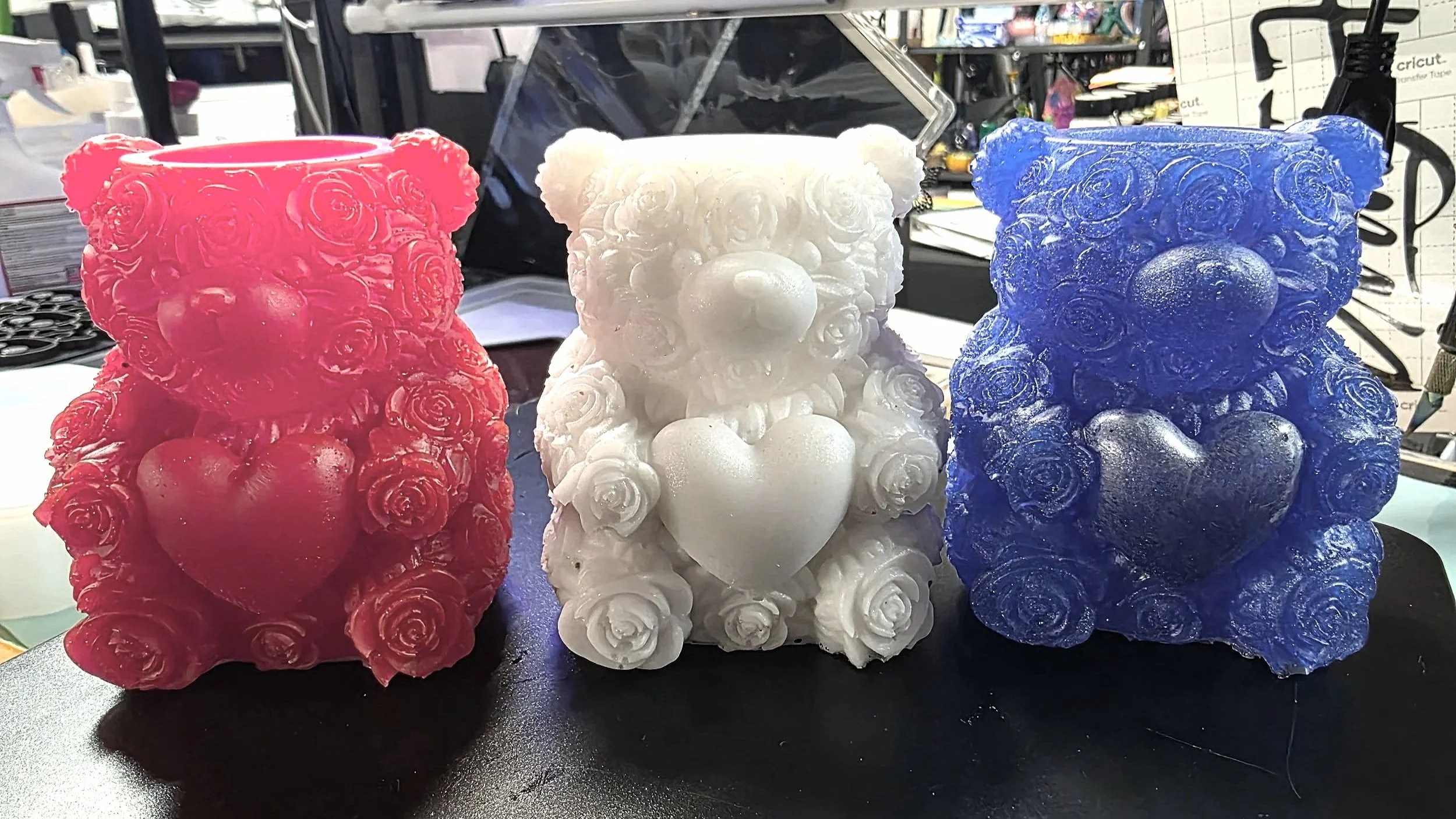 These rose‑textured resin bears feature detailed floral patterns and bright hand‑painted colors. Each one holds a heart, making them a sweet and thoughtful gift for Valentine’s Day, anniversaries, or romantic décor. Their sculpted rose design gives them a unique, boutique look.